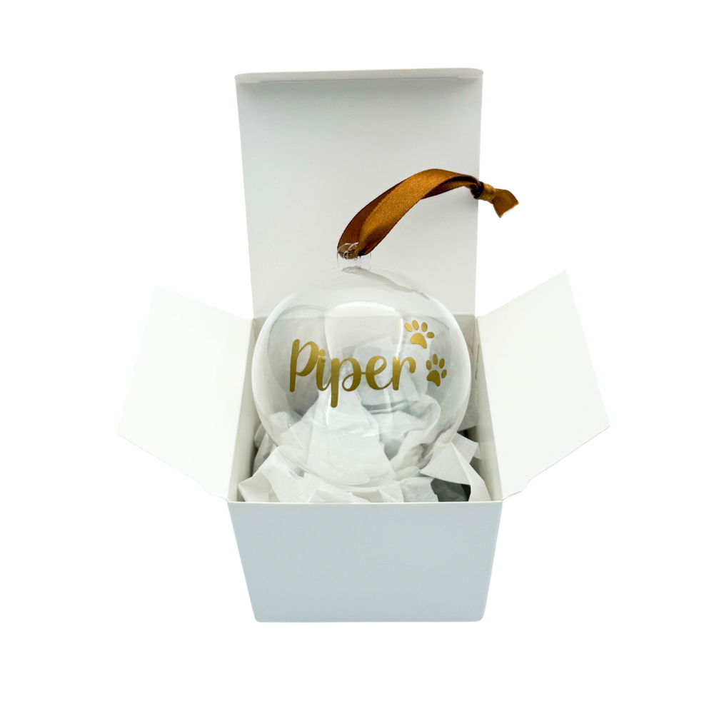 The baubles are made of transparent plastic in two halves that pull apart so they can be opened and refilled as many times as you like, year after year. Hung with a ribbon to match your text colour.